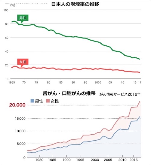 今度は「歯並び」のせいにしています。舌がん・口腔がんの最大の原因は喫煙と飲酒と長く言われてきましたが、以下のグラフを並べると、なんという杜撰な理論であるかがわかります。