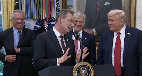 写真には左から、保健福祉長官であるロバート・F・ケネディ・ジュニア氏、ファイザーCEOのアルバート・ブーラ氏、メディケア・メディケイドサービスセンター管理者であるメフメト・オズ博士、そしてドナルド・トランプ大統領が写っています。