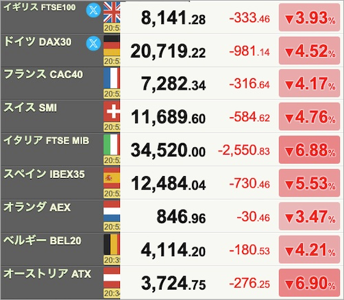 2025年4月4日午後9時頃の欧州の主要株価指数