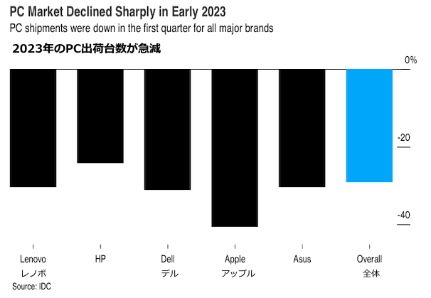 アップルの出荷が40%急減、コロナ特需解消でPCメーカー苦戦