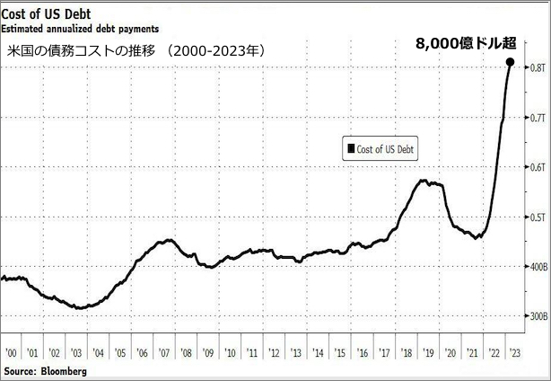 3月末時点で、米国の債務返済にかかる推定年間費用は 8,000億ドル (約 107兆円)を超えており、これは過去のどの時期よりも 40%以上高くなっている。