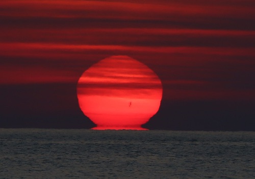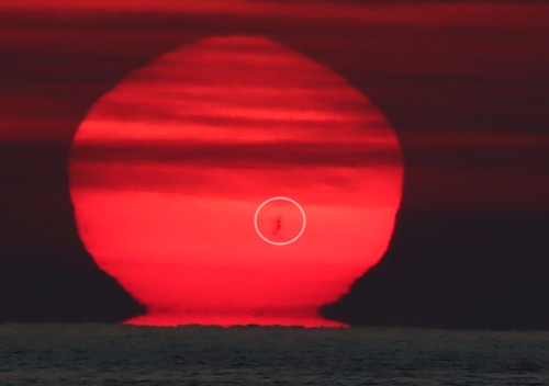 日記 歪んだ赤い太陽の中に浮かぶ巨大黒点 2023年7月13日 nofia 7月12日、イタリアのサンベネデット・デル・トロントにて David Marshall 蜃気楼のために歪んでいるようです。以下の白い円で囲んだ部分は、巨大黒点 3363 です。