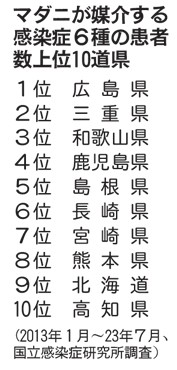 都道府県別の患者数は、日本紅斑熱の最多が広島の30人で、三重17人、熊本10人、和歌山9人と続く。SFTSは山口・宮崎が各10人、長崎9人、高知・大分各7人などいずれも西日本に集中。