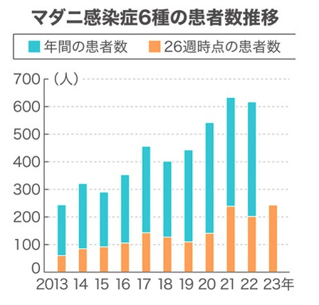 感染研が6種の記録を始めた13年以降、患者数は増加傾向にある。過去最多の21年は633人、22年617人で、10年で倍増。