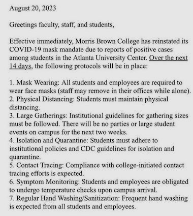 アトランタ大学センターの学生の間で陽性例が報告されたことを受け、カレッジは直ちに、新型コロナウイルス感染症対策としてのマスク着用義務を復活させました。