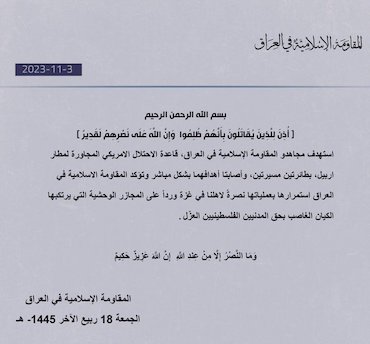 イラクのイスラム抵抗勢力は、11月3日夜、アルビル空港近くの米軍基地を 2機の無人機によって標的にしたと発表した。