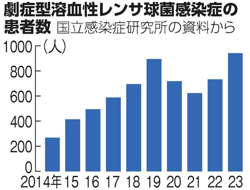 「人食いバクテリア」とも呼ばれる劇症型溶血性レンサ球菌感染症の2023年の患者報告数が過去最多となった。急激に症状が進み、致死率は3割とされる。