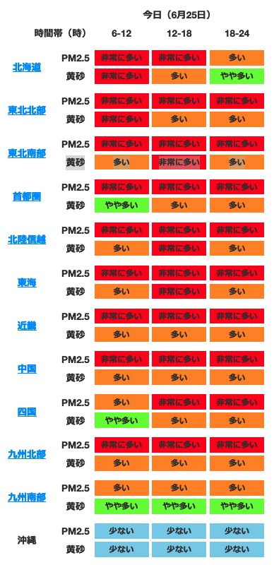 ニュース 今日(6月25日)は、日本全国でPM2.5濃度が大変に高い模様 2024年6月25日 nofia 九州大学応用力学研究所の SPRINTARS というページの予測です。 sprintars.riam.kyushu-u.ac.jp ただ、気象庁の予測とはかなり違うのですけどね。