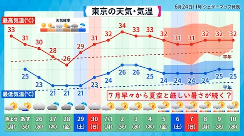 ところが、来週、7月早々には、東京をはじめ、高知、福岡、鹿児島ともに、晴れマークが並んでいて、連日33度前後の厳しい暑さが続く予想となっています。