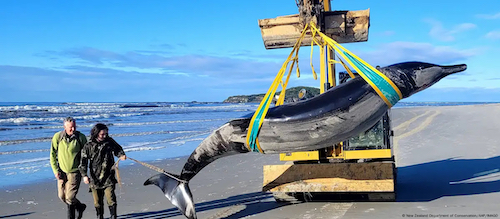 ニュージーランド:「世界で最も珍しいクジラ」が海岸に打ち上げられる