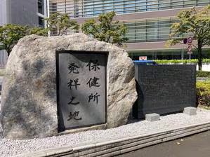 所沢駅東口のロータリーに建つ「保健所発祥之地」の石碑=埼玉県所沢市