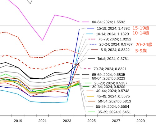 オリジナルのグラフは非常に大きなサイズですので、目立つ部分を抜粋しています。2023年から若い世代に特に増加しているようです。なお、ここには「新型コロナ」、「インフルエンザ」、「性感染症」は含まれません。それ以外のすべての感染症ということになります。