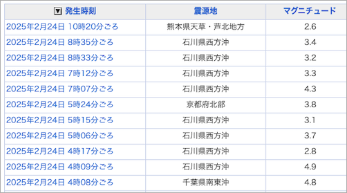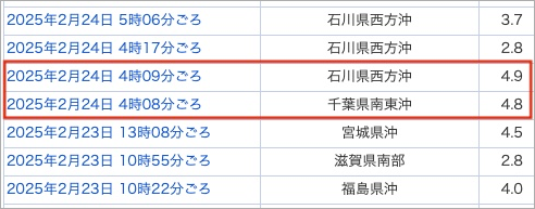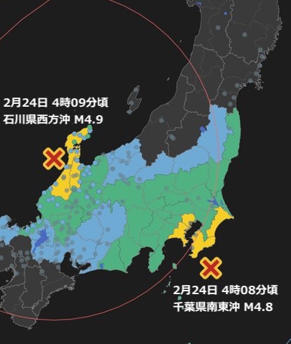 ニュース 太平洋側と日本海側で、ほぼ同時に同程度の規模の地震が発生するという珍しい現象 2025年2月24日 nofia 2月24日午前4時8分頃に以下のように、関東を挟むような形で、ほぼ同時に両サイドで地震が起きていました。 以下のふたつの地震ですね。規模も、M4.8 と 4.9 と、ほぼ同じ。珍しい現象ですね。 地震情報 石川県西方沖のほうは、やや群発地震めいています。 地震情報