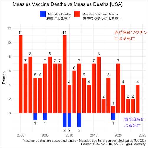 以下の青は麻疹そのものによる死亡数で、赤が「麻疹ワクチン」による死亡数です。CDC の VAERS (ワクチン有害事象報告)の数値が元となっています。