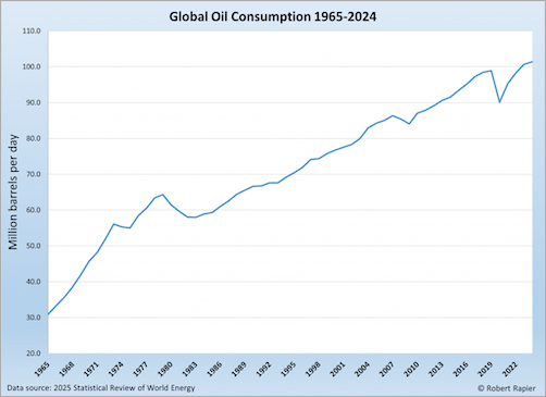 1965年から2024年の世界の石油消費量の推移