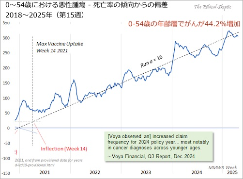 これは19週間前にこのチャートを作成した時よりも7,500人多い死亡者数で、13%ポイント上昇しています。2021年以前のこの死亡率の確立された下降傾向が持続的に破られています。私たちはただ指をくわえてこの事態を見過ごすつもりですか?