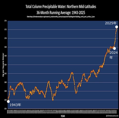これは、北半球の中緯度地域の「全柱可降水量」の推移とのことで、全柱可降水量というのは、説明によれば、