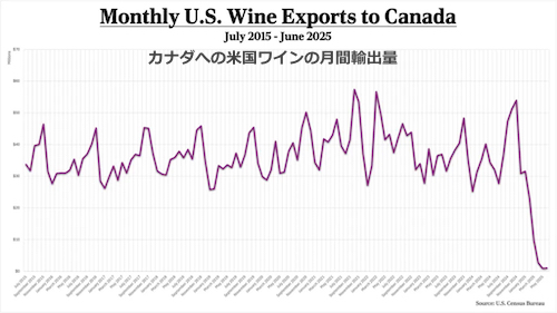 つい最近まで、北の隣国カナダはアメリカワインにとって最大の国際市場だったが、米国国勢調査局が発表した新たな統計によると、今年 6月の輸出量は 2024年比で 96.8%という驚異的な減少を見せている。