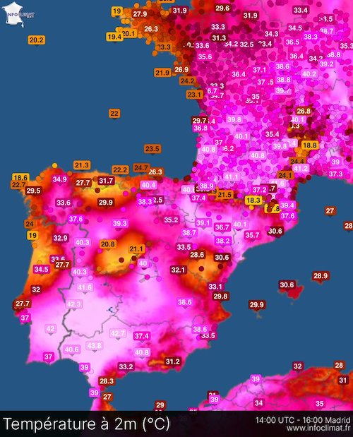 暑いところでは、平年より 8℃から 12℃気温が高いそうです。最も高い気温を記録したのは、スペインで 45.5℃、ポルトガルで 44.6℃、フランスで 42.9℃だそう。まあ……暑いですね。