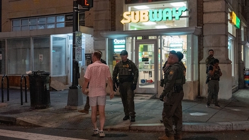 2025年8月10日、ワシントンD.C.のUストリート回廊で国境警備隊とFBI捜査官とのやり取り中に、ショートパンツ姿の男がサンドイッチで警察官を襲撃したとして逮捕された。