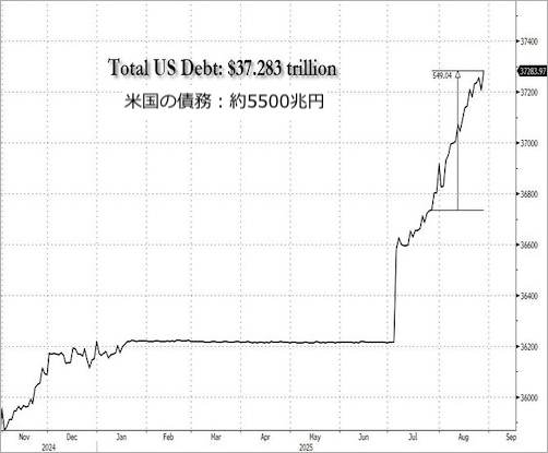 ブレインデッドニュース, 経済崩壊 アメリカの債務は「過去1カ月」で約80兆円増加 2025年8月29日 nofia もう誰もかれもどうでもいい状態となっていますけれど、では、今後どうなるのかといえば、それは誰にもよくわかりません。いずれにしても、アメリカの債務の増加は加速しています。 2024年11月からの米国の債務の推移 zerohedge