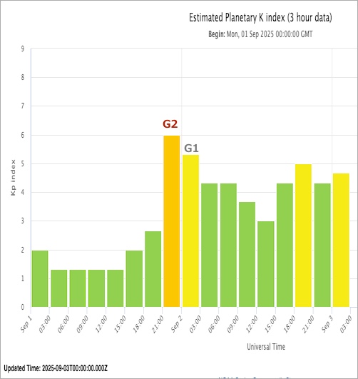 日記 昨日から最大G2の地磁気嵐が発生中 2025年9月3日 nofia オレンジがG2(下から2番目)、黄色がG1です。大した磁気嵐ではないのですけれど、昨日からどうも眼振が強いなあと思って、見てみましたら時期嵐が発生していました。 日本時間9月3日までの過去48時間の時期嵐発生状況 noaa.gov