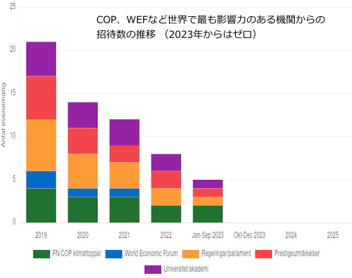 数字がすべてを物語っている。2019年、トゥーンベリ氏は世界で最も影響力のある機関から 21件もの名誉ある招待状を受け取った。2023年10月以降はどうだろうか? ゼロだ。