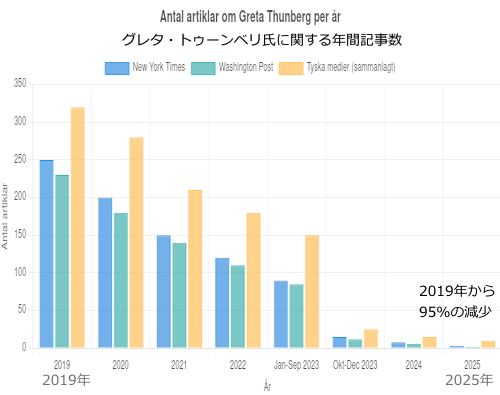ニューヨーク・タイムズ紙は、2018年から 2023年9月まで、グレタ・トゥーンベリ氏に関する記事を毎年数百本掲載した。しかし、2025年には、わずか 3本の記事でしか言及されていない。