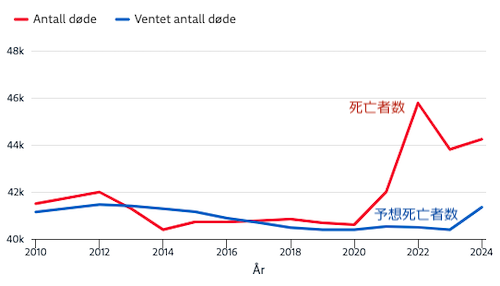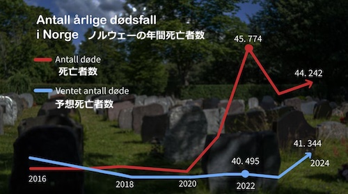 2022年から2024年の期間、パンデミック前の傾向と比較すると、予想よりも 11,588人多い死亡が確認された。これは第二次世界大戦中のノルウェー人の死者数を上回るとホワイト氏は述べている。
