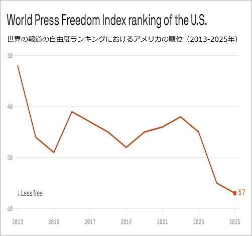 ニュース, 日記 アメリカの報道の自由度ランキングの順位が近年最下位に 2025年9月19日 nofia 実際には、どこの国にもあまり報道の自由度などはないですけど、アメリカはまだまだ下がると思われます。 世界の報道の自由度ランキングにおけるアメリカの順位の推移 Melanie D’Arrigo