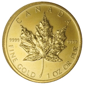 もう、一般に販売されている金貨もムチャクチャな価格に上昇していて、数年前まで1オンス20万円代だった金貨(しかも中古)が、最安で 70万円を超えています。以下は、楽天で販売されているカナダのメープルリーフ金貨ですが、1オンスって、500円玉より少し大きいくらいのサイズです。