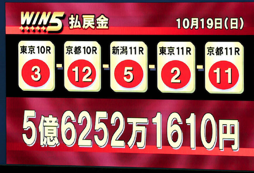 JRAが発売した10月19日のWIN5は、的中1票で、払戻金は5億6252万1610円。歴代1位の高額配当となった。