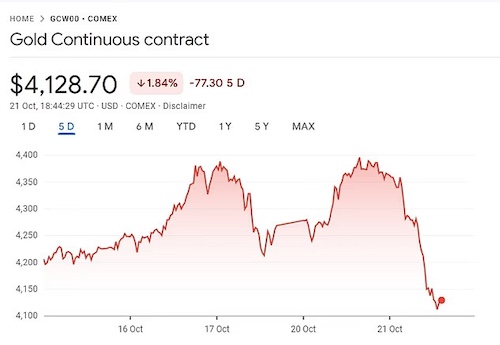 金価格は今週、新たな記録に急騰した後、火曜日 (10月21日)に劇的な下落に見舞われ、1日での下落としては 2013年以来最大となった。