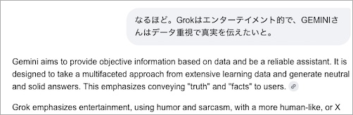 質問:なるほど。Grokはエンターテイメント的で、GEMINIさんはデータ重視で真実を伝えたいと。