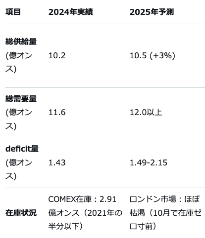 Silver Institute(銀業界の権威機関)の2025年報告書によると、グローバルな銀市場は以下のような状況です。需要が供給を上回る「deficit」が続き、在庫が枯渇寸前となっています。