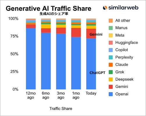 となっていて、ChatGPT は、過去1年一貫してシェアを失い続けています。 Grok は 2.5%。