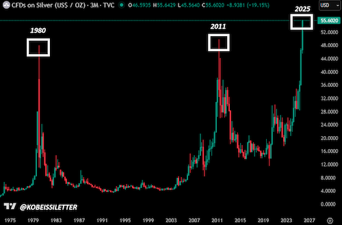 銀スポット、55ドル突破して史上最高値を更新 – 需給逼迫感なお続く