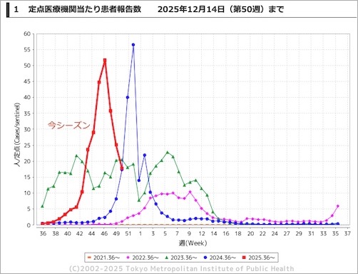 日本のインフルエンザ患者報告数(2025年12月14日まで)