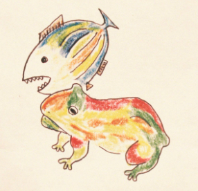 「威嚇し合うカエルと魚」の幻視画