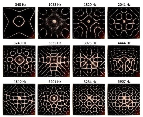 > 金属・プラスチック・ガラス・ボウルなどにピンと張ったラップなどの平面にスピーカーなどで振動を与え音程を変えると、共鳴周波数において平面の強く振動する部分と、振動の節となり振動しない部分が生じる。ここへ例えば塩や砂などの粒体を撒くと、振動によって弾き飛ばされた粒体が節へ集まることで、幾何学的な模様が観察される。 Wikipeida
