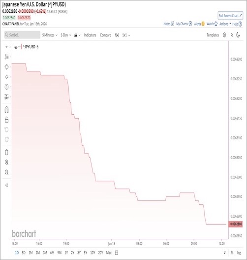 経済崩壊 この2日間の円/ドルの推移 2026年1月14日 nofia ドル側から見ると、その急落ぶりがわかりやすいですね。生き残ることきができない業種が数多く出てきそうな勢いです。日本はどうなっちゃうんでしょうかねえ。 2026年1月13日〜14日の円/ドルの推移 Barchart
