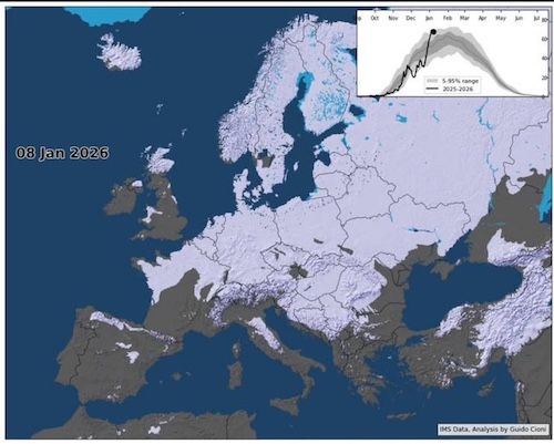 2026年1月8日のヨーロッパの積雪面積