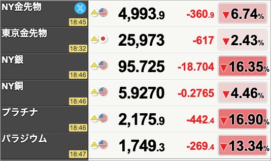 ブレインデッドニュース, 経済崩壊 貴金属市場がさらに暴落中 2026年1月30日 nofia どうなっちゃうんだ、これ…(やや冷や汗)。先ほどの記事でふれましたけれど、すでに昨日、暴落してますからね。 日本時間2026年1月30日午後6時過ぎの貴金属価格の推移 nikkei225jp.com