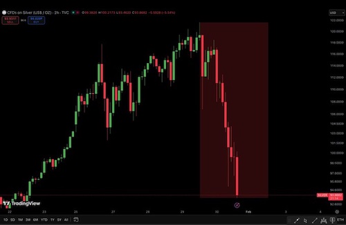 ブレインデッドニュース, 経済崩壊 銀価格が2日間で23%下落し、約220兆円が市場から消失 2026年1月31日 nofia 何かの総力戦が起きてる。 nikkei225jp.com 2026年1月22日から1月31日までのNY銀価格の推移 Ash Crypto
