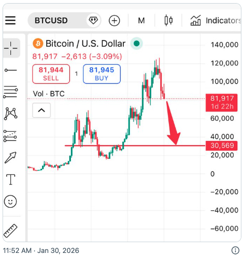 「ビットコインの次の大きなサポート は3万ドルだ」と、週末に X のフォロワー 43万人以上に向けて、以下のように投稿した。彼は「残念ながら、そうなりそうだ」と記した。