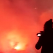 オリンピック開催地ミラノで、警察が煙幕弾を投げる抗議者に対し放水砲を発射