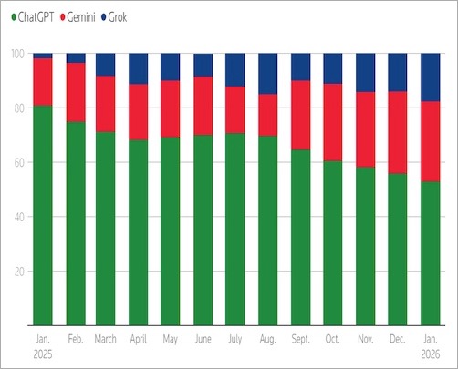 ChatGPT(緑)とGemini(赤)とGrok(青)のシェアの推移