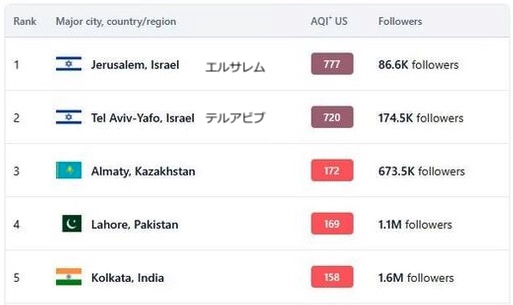 空気質監視サイト IQAir は、イスラエルの都市をカザフスタンのアルマトイ、パキスタンのラホール、インドのコルカタよりも上位に挙げている。