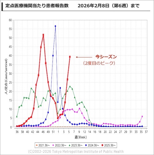 以下は東京都の状況ですが、「インフルエンザ患者数が16万人超」という報道などを見ましても、日本全体で同じような 2度目の流行に入ったようです。
