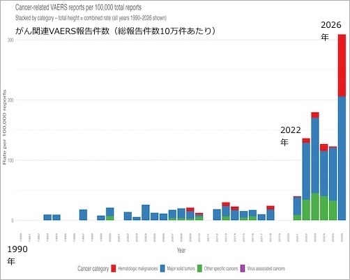 興味深いデータですね。2022年からグッと増えているのは理解できなくもないですが、2026年が飛び抜けて増えています。特に血液のがんと、一般的ながんの増え方がかなりのものです。2026年って、まだ 2カ月ほどしか経っていないのですが…。